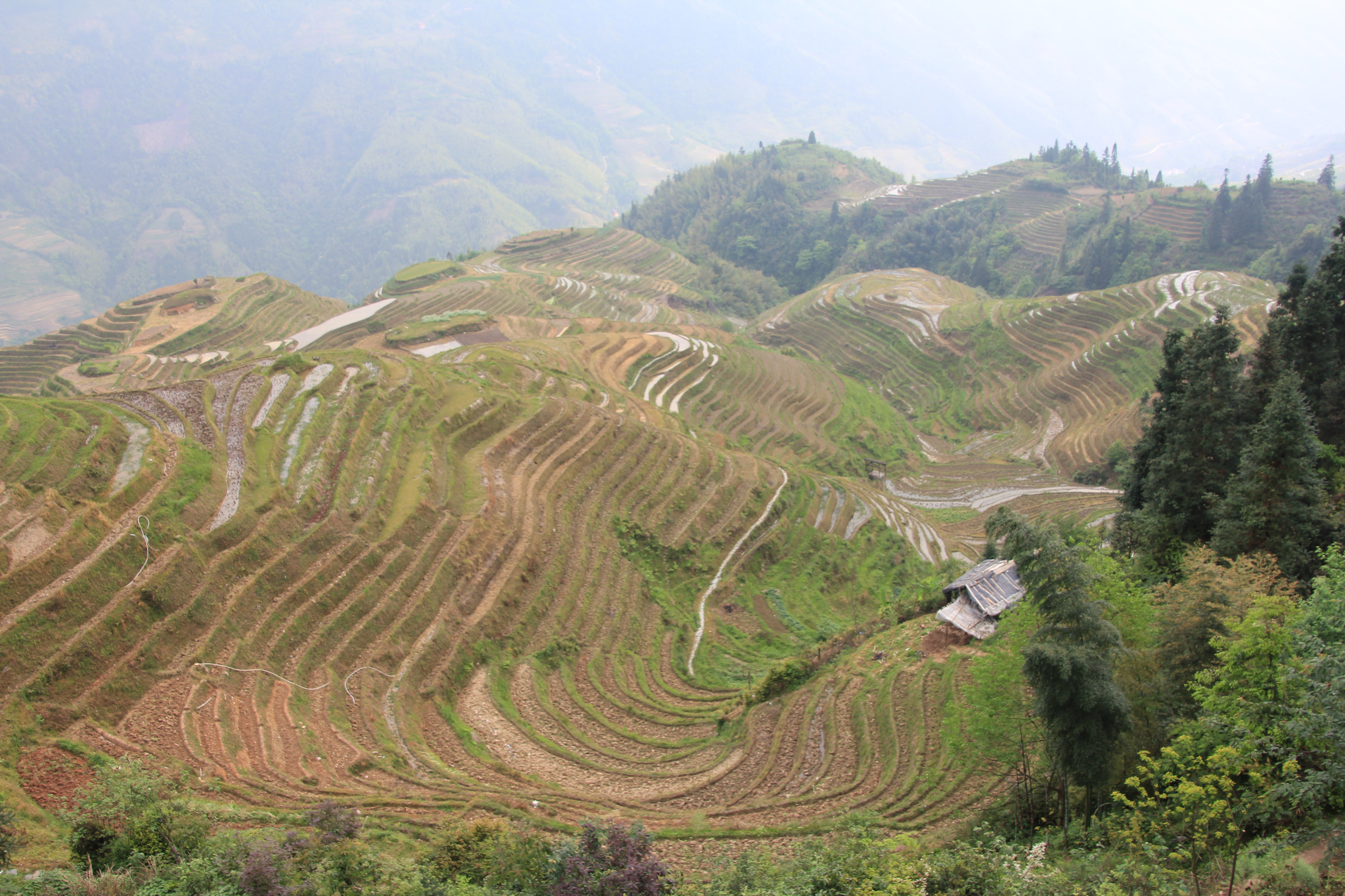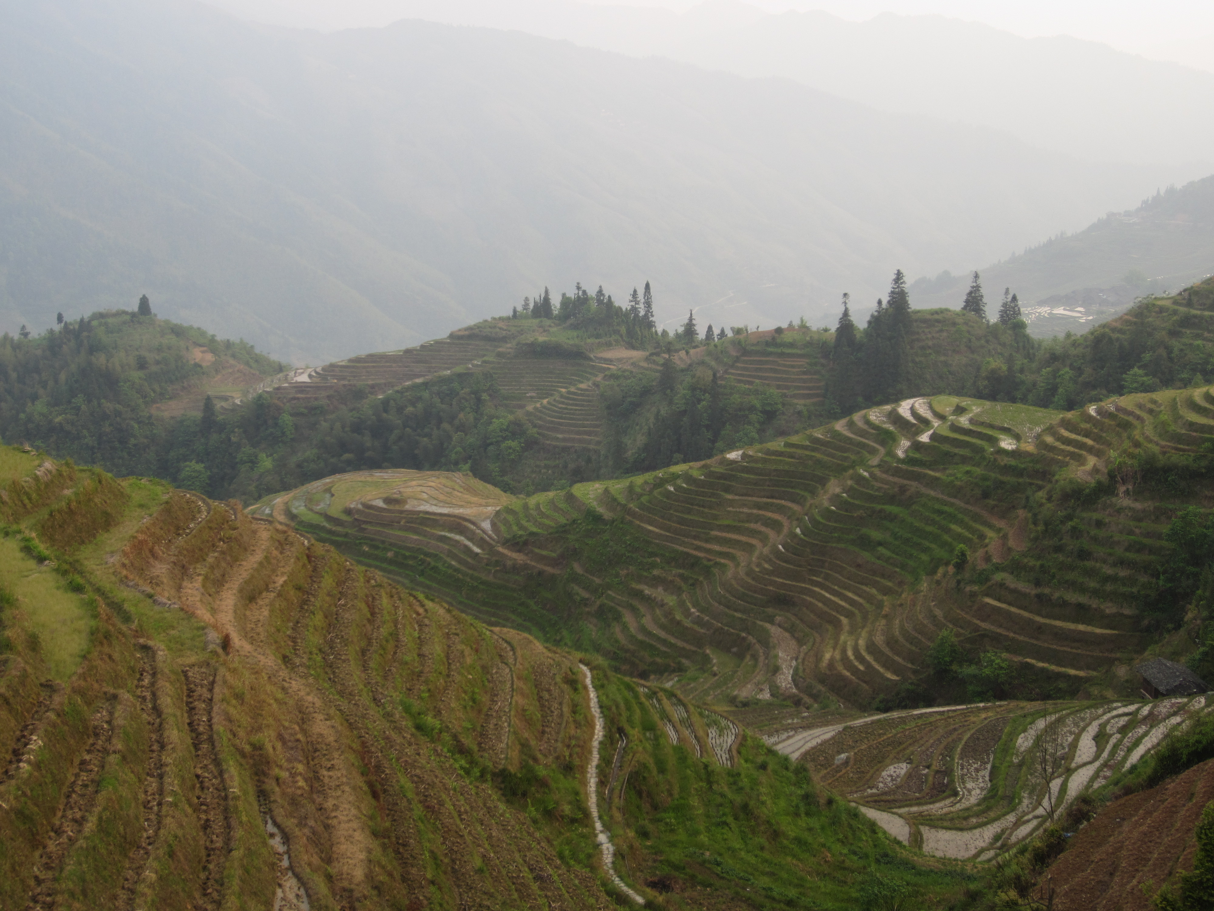 I forget we are at a high altitude. The mountains, growing ever paler as they reach into the sky, stick up past the horizon. The rice terraces are massive, truly impressive. Though not all are filled, some were, giving us a glimpse of the famous mirror-effect.