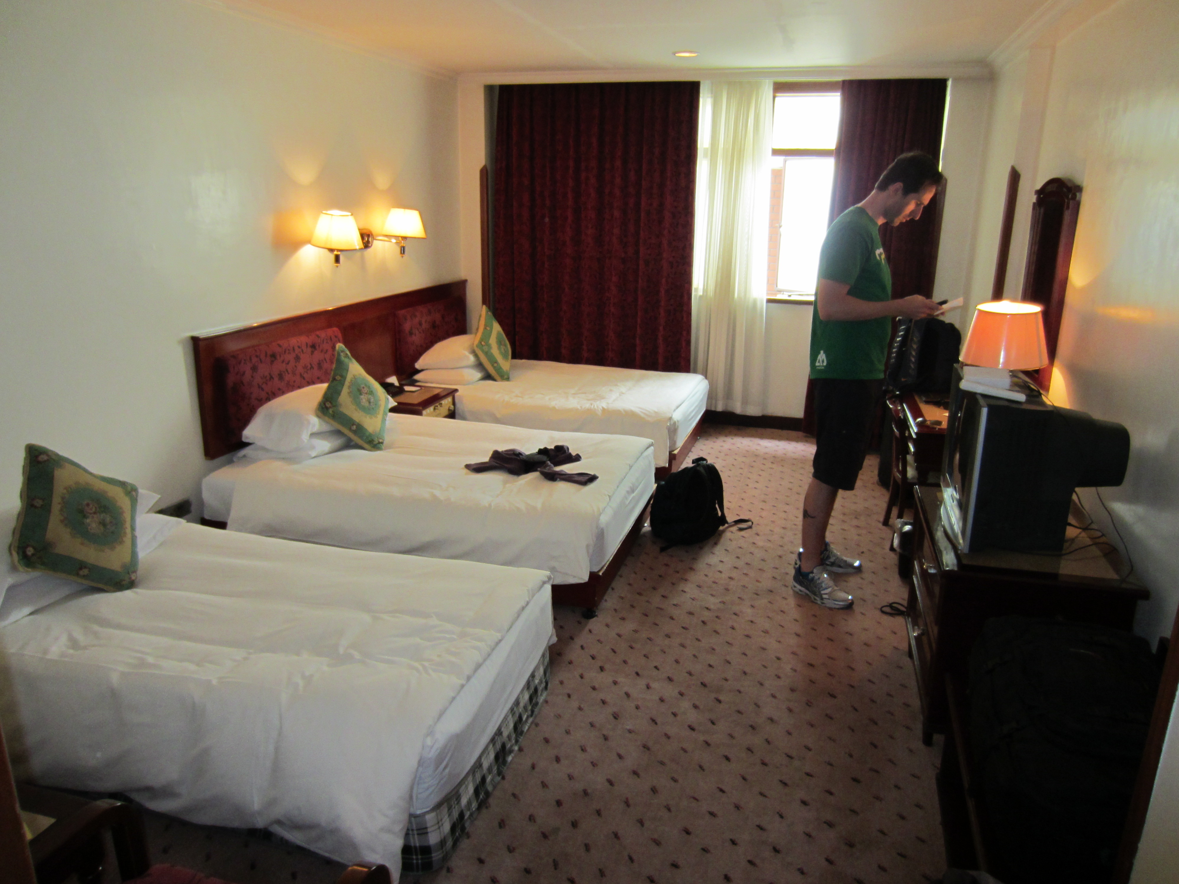 A bit before 21:00. I’m back in the hotel room alone. Chris and Frank are downstairs in the lobby, trying to get on the Internet. Everyone says they have wifi, but it usually never works in the rooms. Hangzhou Hua Yuan Hotel. This place is something else. Nice, but I noticed the rooms are available by the hour and there are condoms included in the customary basket of things like nuts and soda. They bring breakfast to your room in the morning, there doesn’t seem to be much of a lobby. It’s a smoking room. The ceilings on this floor are absurdly low. Even I feel like they’re looming close to my head. I get the feeling the triple rooms are not utilized much.